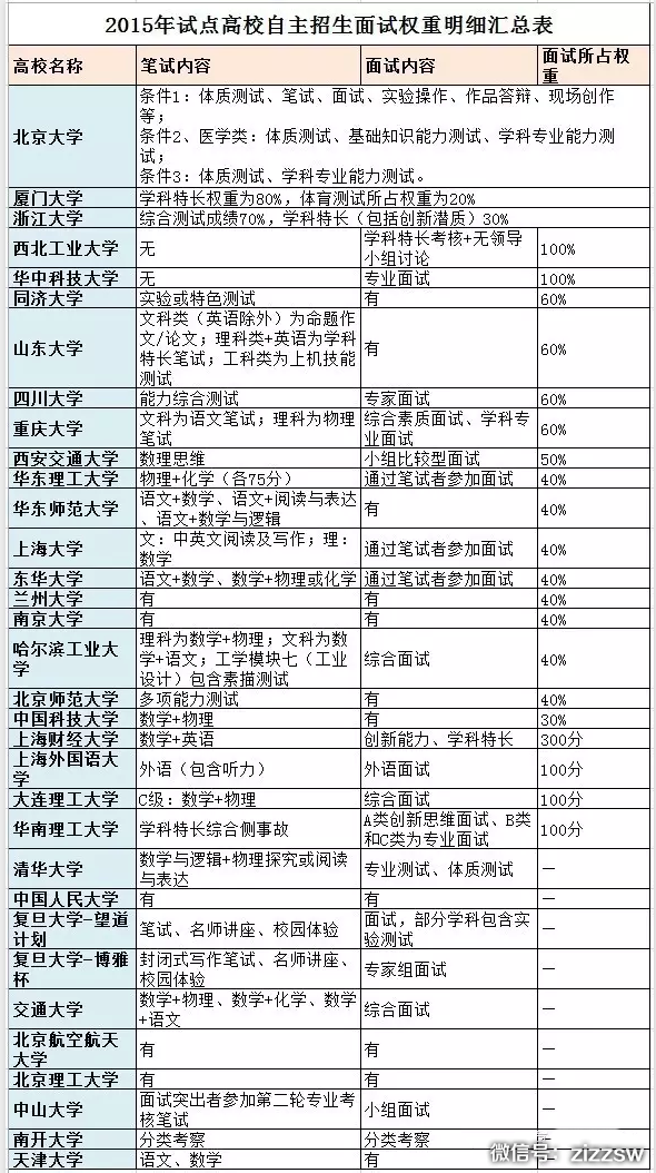 2016年的自主招生,即将拉开序幕。上一年高考加分的瘦身运动使得自主招生成为高考录取前最重要的加分途径,再加上教育部对高校自主招生名额的限制,预计2016年自主招生的竞争会更加激烈。2015年除了面试成绩所占比重增加,在面试形式、内容、创新度上也有所改变。针对考生和家长普遍关注的高校自主招生笔试、面试权重,小编准备了去年自主招生笔试面试权重明细汇总表供大家参考: