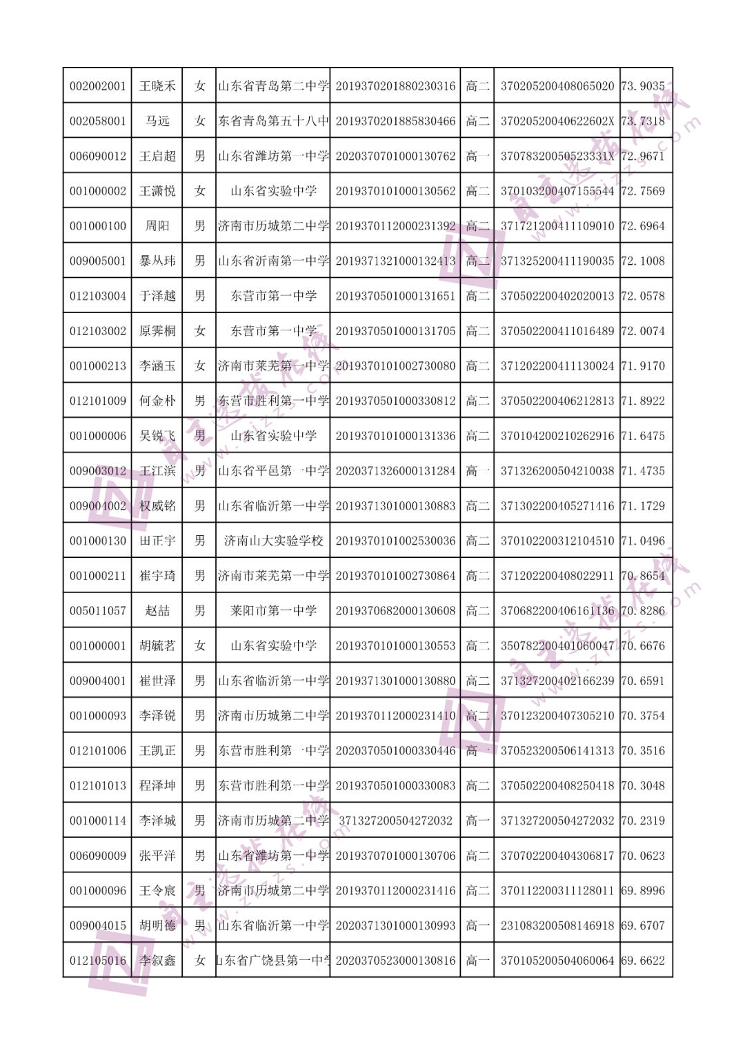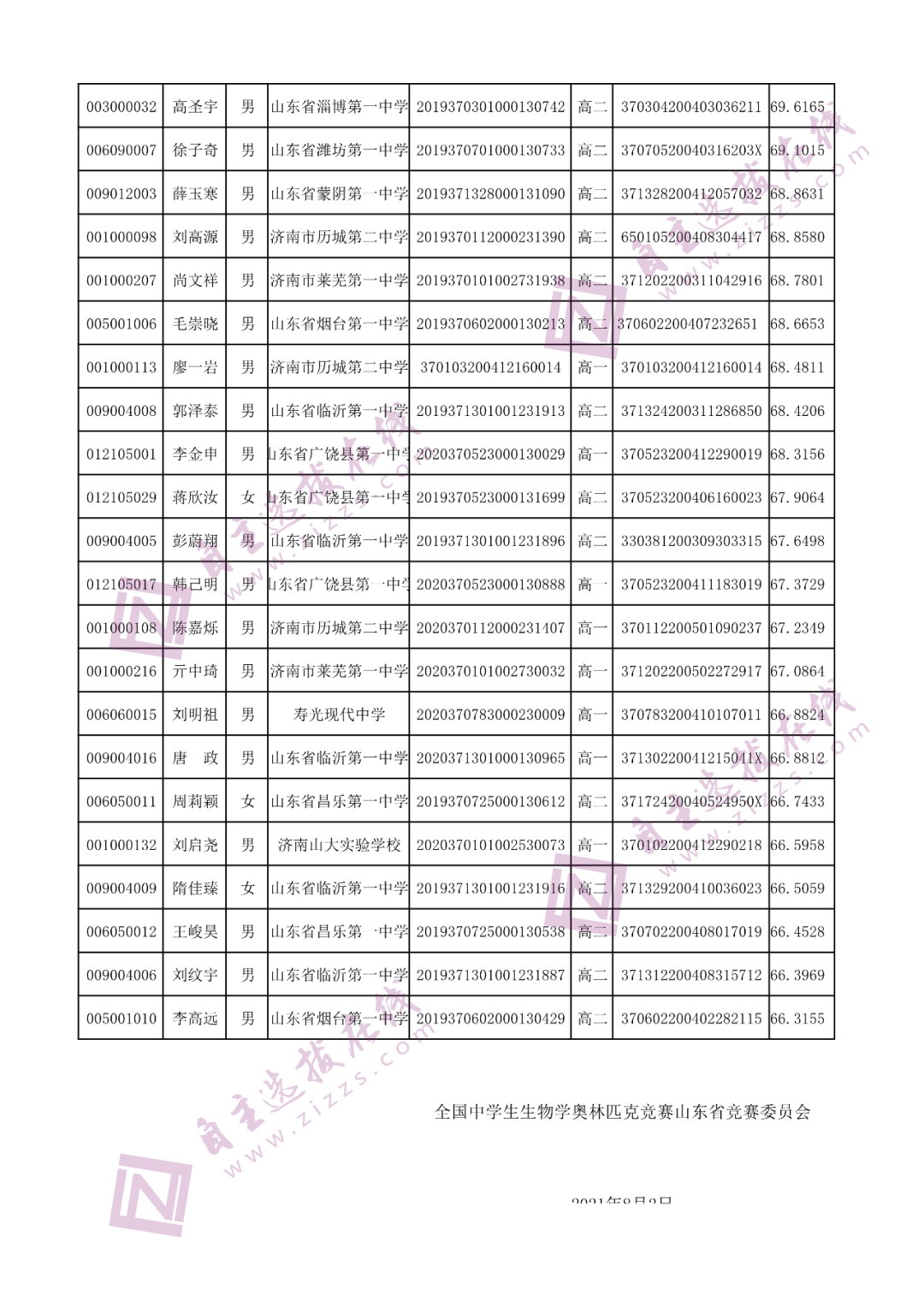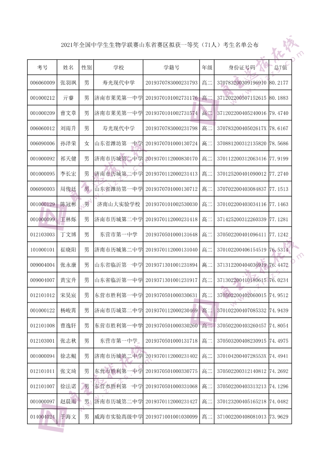 山东省2021年全国中学生生物学联赛省一获奖名单及成绩已经出炉,一等奖共计71人。