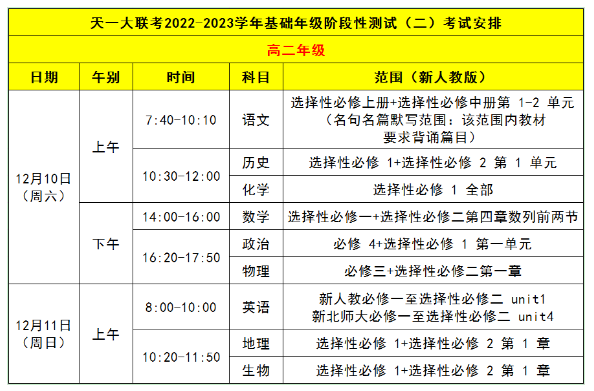 天一大联考2022-2023学年高二阶段性测试(二)考试安排