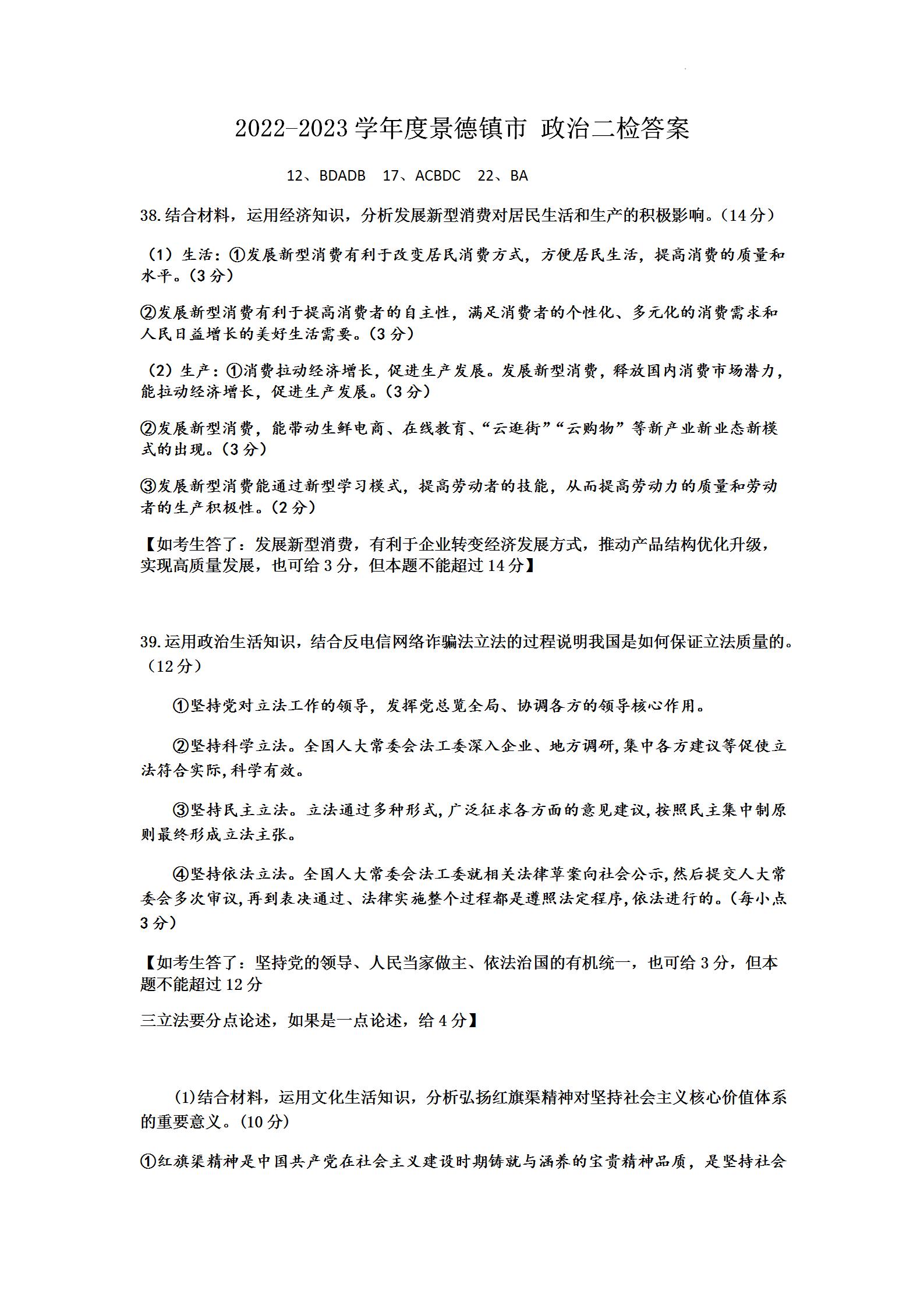 江西省景德镇市2023届高三第二次质量检测政治答案