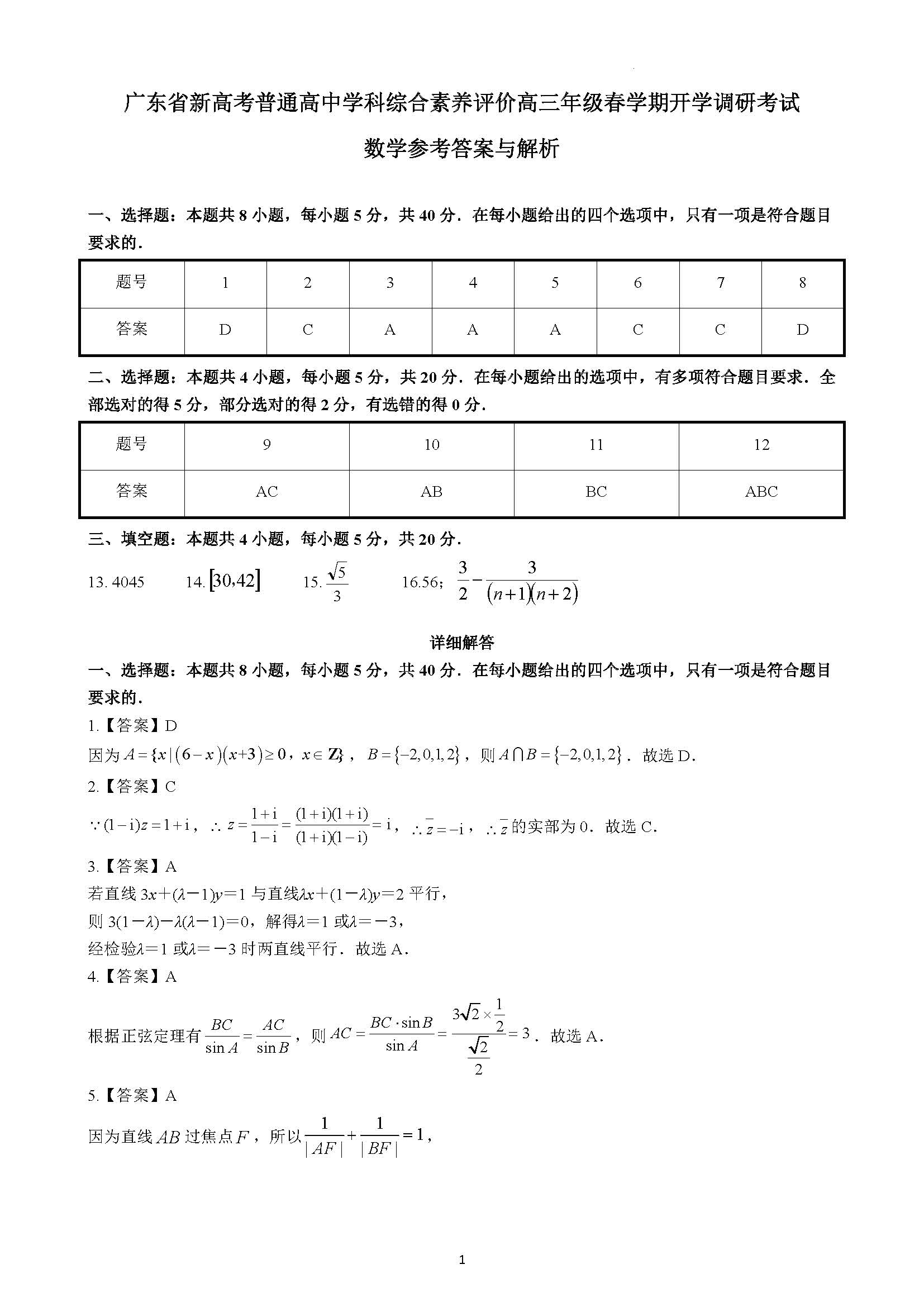 广东省新高考普通高中学科综合素养评价2023届高三下学期开学调研考试数学答案
