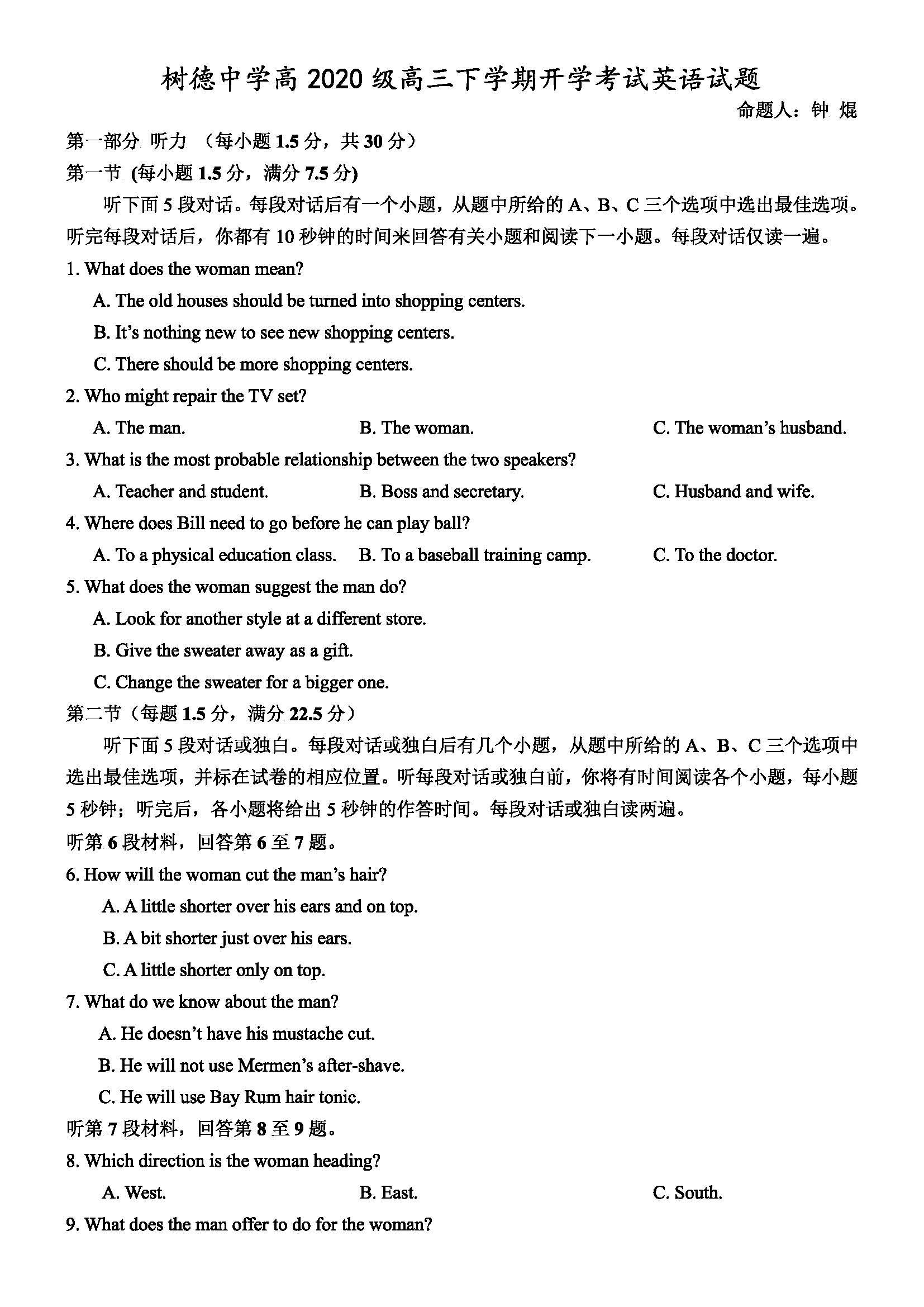 四川省成都市树德中学2023届高三下学期开学考试英语试题