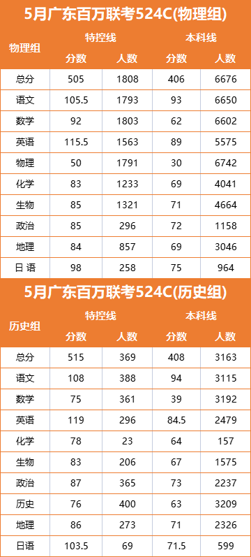 5月份进行的百万联考(524c)分数划线情况公布啦!快跟广东家长圈(ID:gdgkjzq)一起看看!