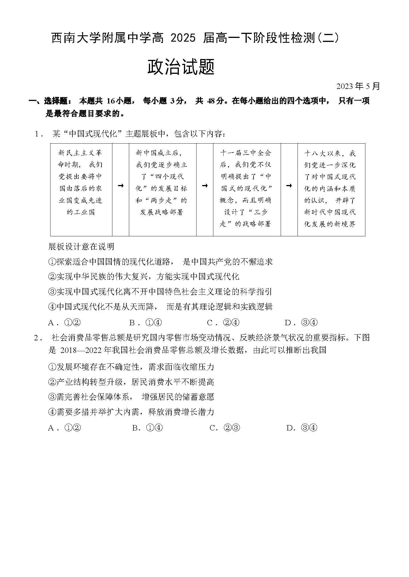 重庆市西南大学附属中学2022-2023学年高一下学期5月联考政治试题