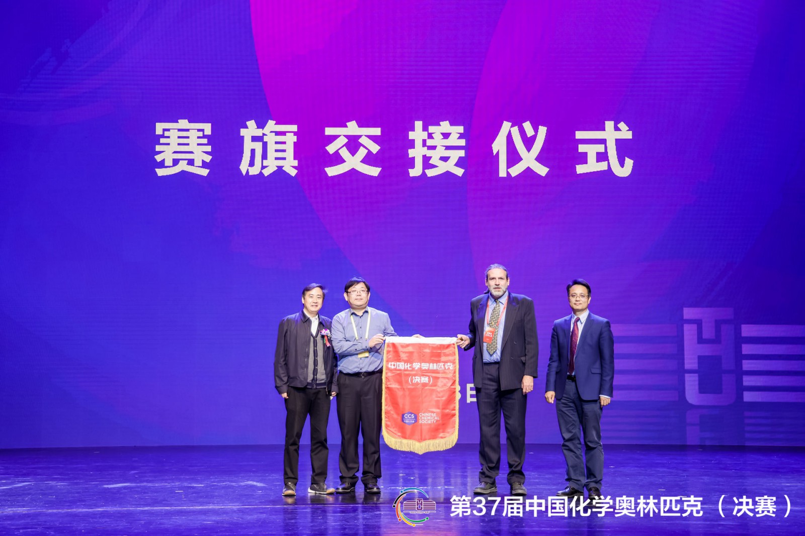 闭幕式的最后,中国化学会副理事长兼秘书长范青华宣布下一届承办单位。2024年,第38届中国化学奥林匹克(决赛)将在广东省举办,由广东省化学学会、中山大学共同承办。广东省化学学会理事长、中山大学化学学院教授毛宗万向大家发出下一届活动的参赛邀请,随后进行赛旗交接仪式。
