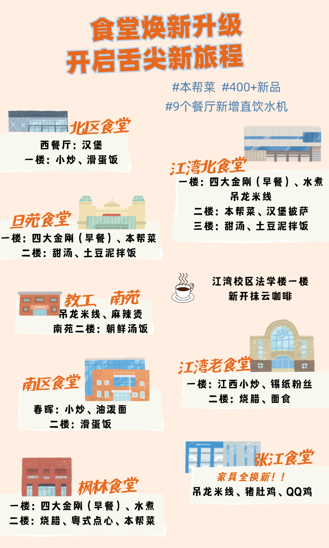 复旦大学不同校区食堂也不少,邯郸校区有5个食堂,分别是北区、旦苑、南苑、教工食堂(南小食)和南区食堂,江湾校区有3个食堂,枫林校区有2个食堂,张江校区有1个食堂,如果算上民族餐厅,复旦有整整15个食堂!
