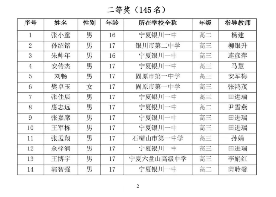 宁夏2025年第41届全国高中数学竞赛联赛省二获奖名单今日公布,共计145名考生入选宁夏2025年第41届全国高中数学联赛省二获奖名单。自主选拔在线特整理名单详情,完整名单如下: