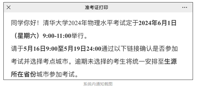 在初审阶段中,清华大学2024年 “物理水平考试” 考试已经在系统内通知了考试延期,目前,官方已在准考证打印通知中,明确了本次考试时间。不仅如此,考生还需要再确认是否参加考试并选择考点城市。以下为通知详情:
