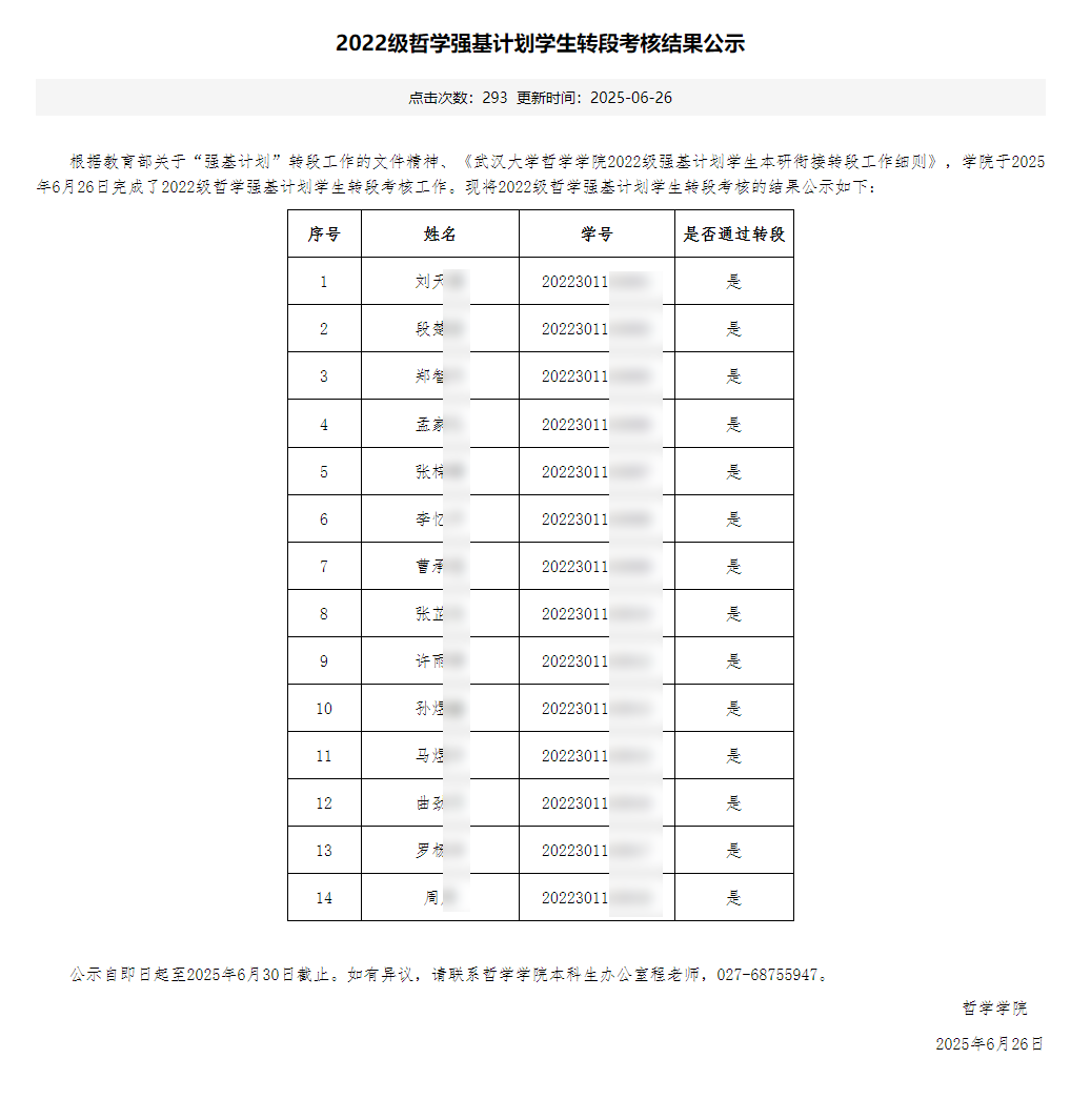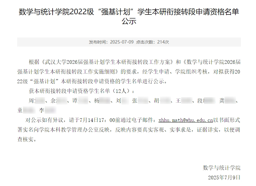根据目前已公布的数据来看:武汉大学数学与统计学院共有12人获得强基计划转段资格,哲学学院共有14人通过转段考核成功本研衔接。