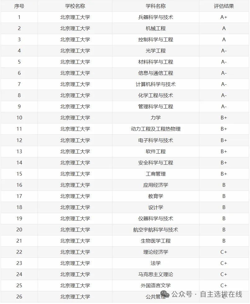 在第四轮学科评估中,北理有1个A+专业,2个A专业,6个A-专业。以下是具体的学科评估结果。