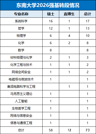 年东南大学2022级强基生中共70人成功转段,其中58人攻读硕士,12人直博。总转段数与前两届差别不大(2020级75人、2021级74人)。