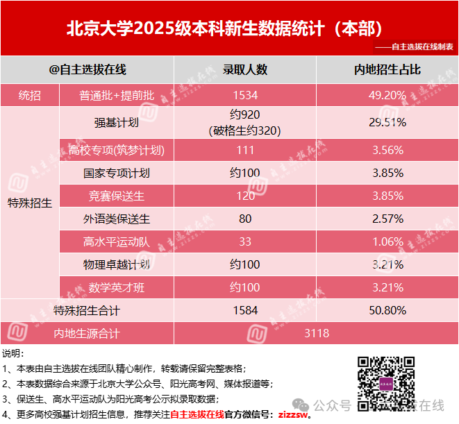 今年是强基计划实施的第六年,北京大学强基计划吸引了5.2万+报名人次,最终2025有约920名优秀学子脱颖而出(其中破格生约320人),占整个内地招生29.51%。可见强基计划依然是特招类型中最为主流的途径!