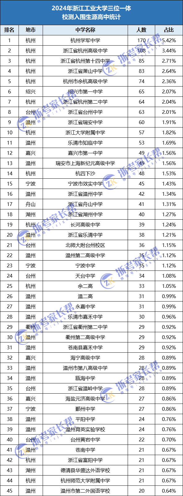 从上面分析的生源来看,浙江工业大学校测入围的高中主要都是一些省内重点高中,一是因为这些学校的学生普遍学考成绩相对比较优异,其次也是因为这些学校的考生和家长对三位一体等升学途径较为重视,从高一高二阶段就开始准备了。
