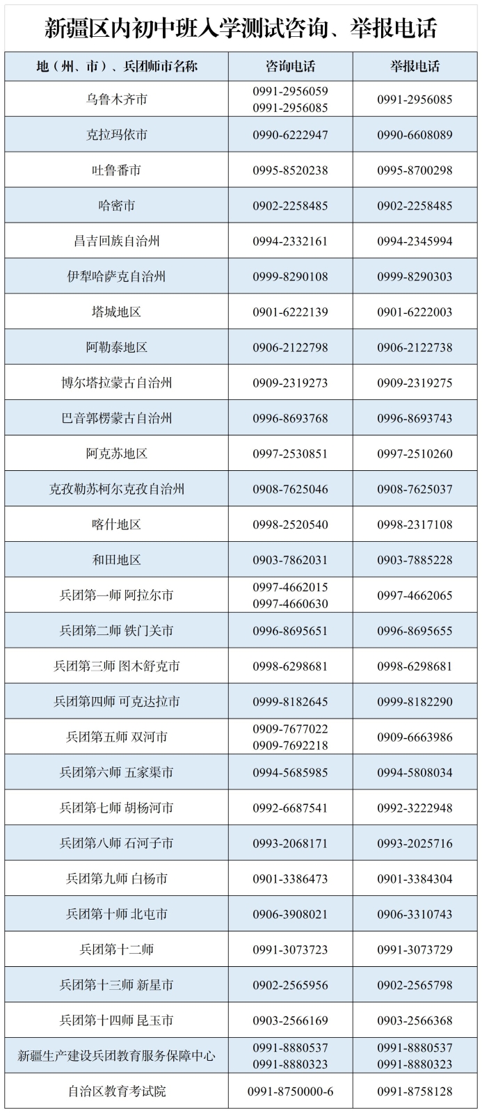 新疆区内初中班入学测试是为选拔一定名额的新疆籍小学生而设立的考试,这些学生将被送到内地指定的城市和学校进行委托培养。新疆考试院公布了初中班各地(州、市)、兵团师市教育局咨询电话,一起来看。