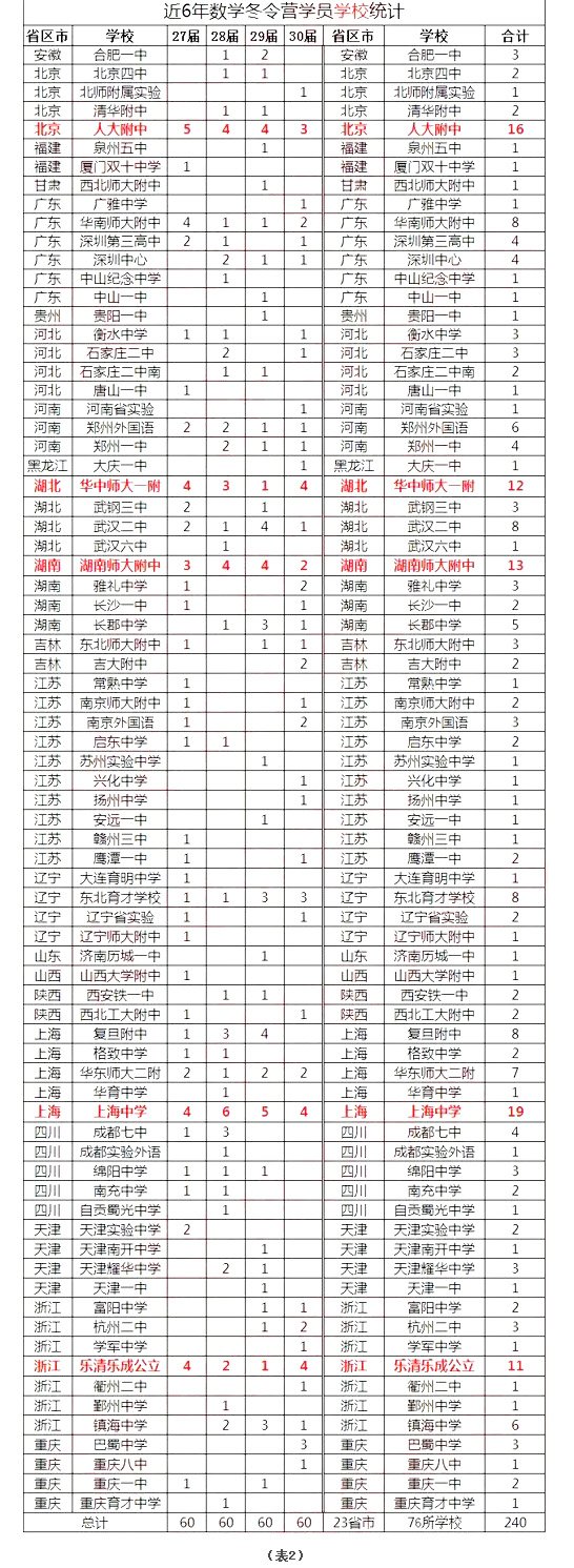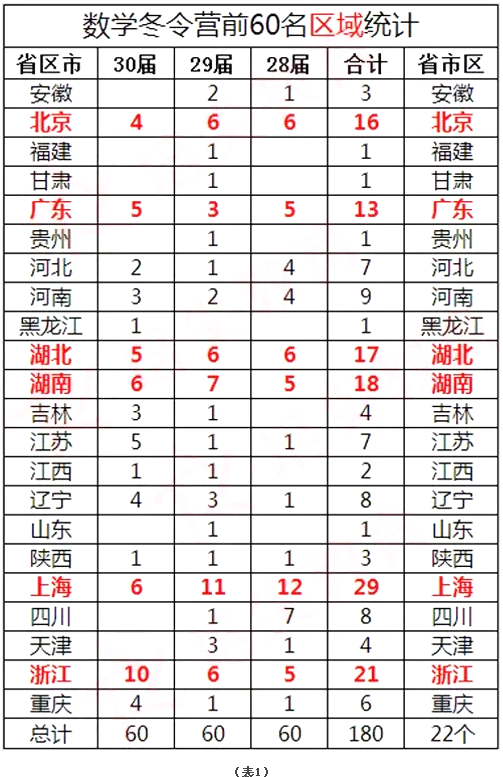 1、近三届的数学冬令营中,上海(29人)、浙江(21人)、湖南(18人)、湖北(17人)、北京(16人)、广东(13人)这六大巨头瓜分了集训队超过六成的名额。