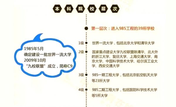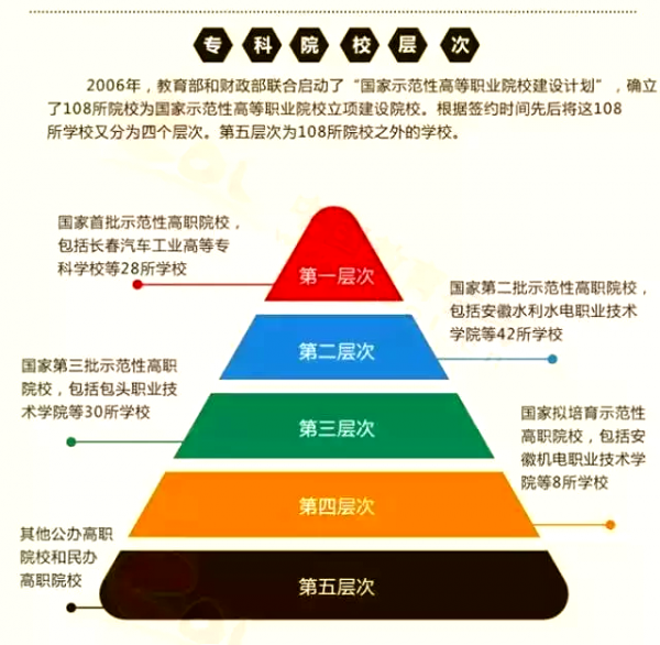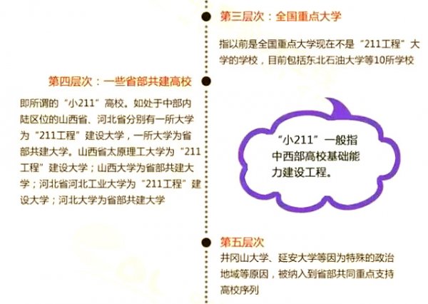 根据国家评价和社会评价的标准,高校可以划分为很多层次。层次越高,投入产出的比率越高。通过比较、分出层次,对高校情况才会有一个大致的了解。只有这样,志愿才会填的好、报的巧。因为我们高考志愿填报,就是要达到最佳匹配,使自身竞争实力和学校竞争实力相吻合,而这些都要基于对高校情况的了解。下面一张图来告诉你高校层次是如何划分的,不明白的赶紧来看看吧。