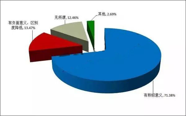 对“高考统一命题”这项措施分歧比较明显。有40.4%的同学认为统一命题有积极意义,而37.71%的同学认为这样做意义不大,还有10.44%的同学持无所谓态度。