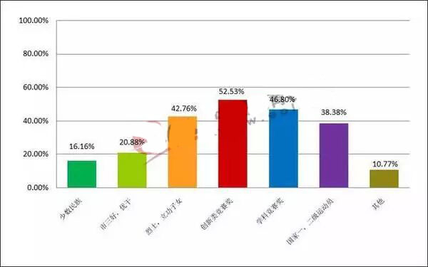高考加分政策大规模调整后,有舆论认为此举将更加鼓励学生积极参加体育、艺术、科技创新及社会实践等活动,此次调查印证了这一判断。调查显示,有52.53%的学生认为创新类竞赛奖作为高考加分项目比较合理。可见,学生比较认同创新能力,认为具备创新能力的同学拥有加分机会是合理的。而“三好、优干和少数民族”的支持者最少。自2015年起,省级优秀学生、思想政治品德事迹突出者、奥赛获奖者、科技类竞赛获奖者及两项体育特长生加分项目已被取消。