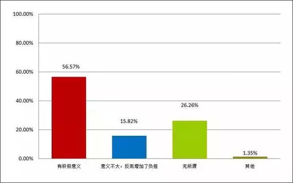 统计显示,有超过半数的学生支持外语实行一年两考,认为社会化英语考试具有积极意义。22.56%的学生则认为意义不大,一年两考反而增加考试负担。少数学生对于这样的改革持“无所谓”态度。