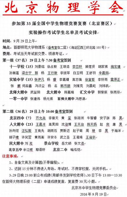 9月19日,北京物理会公布了2016年第33届物理竞赛复赛北京区域实验考试名单,此次参加实验考试的考生,共计73人。