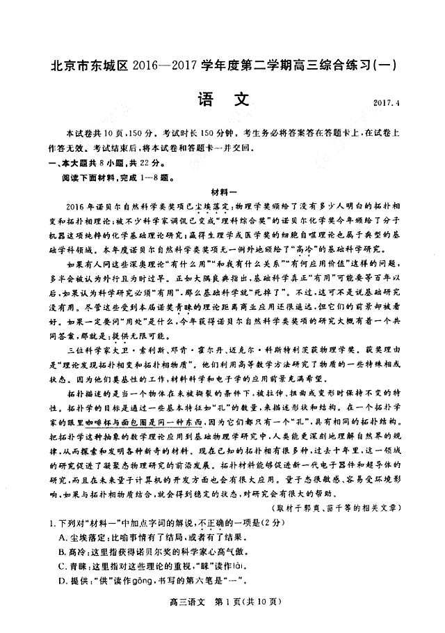 2017东城区高考一模英语试卷&答案2017-04-11