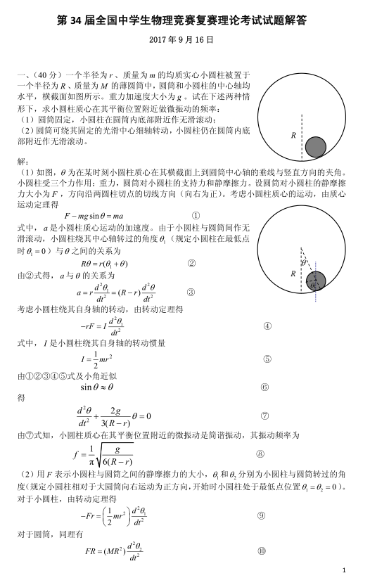 2017年第34届物理竞赛初赛试题&答案公布(官方)2017-09-02