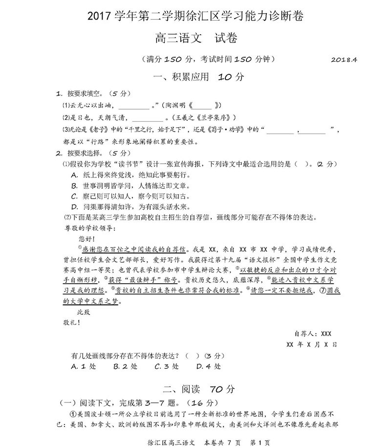 自主选拔在线团队整理上海市徐汇区2018届高三二模语文真题及参考答案,供上海市考生参考。
