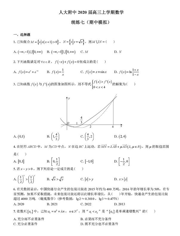 人大附中2020届高三上学期数学期中模拟已经结束,自主选拔在线团队为您同步相关试题,供低年级参考学习。