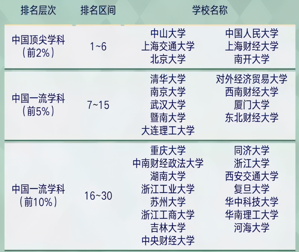 北京大学、对外经济贸易大学、南开大学、复旦大学、上海财经大学、南京大学、厦门大学、西安交通大学第四轮学科评估结果:A+