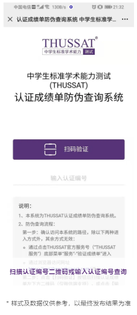 每张认证成绩单左下角设置有唯一的认证二维码和认证编码,可通过微信服务号“THUSSAT服务”菜单“服务”-“验证成绩单”或浏览器访问http://yanzheng.thussat.com进入防伪查询系统对成绩进行核验。
