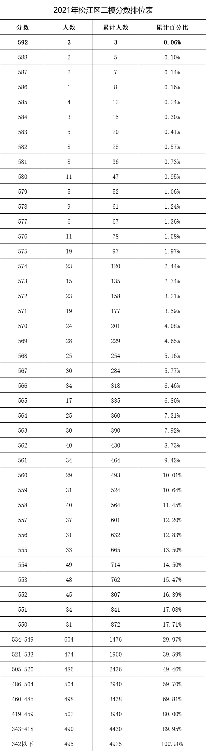 据家长分享,松江区共有4925人参加二模,目前分数已经出炉,自主选拔在线整理了排位表供大家参考。
