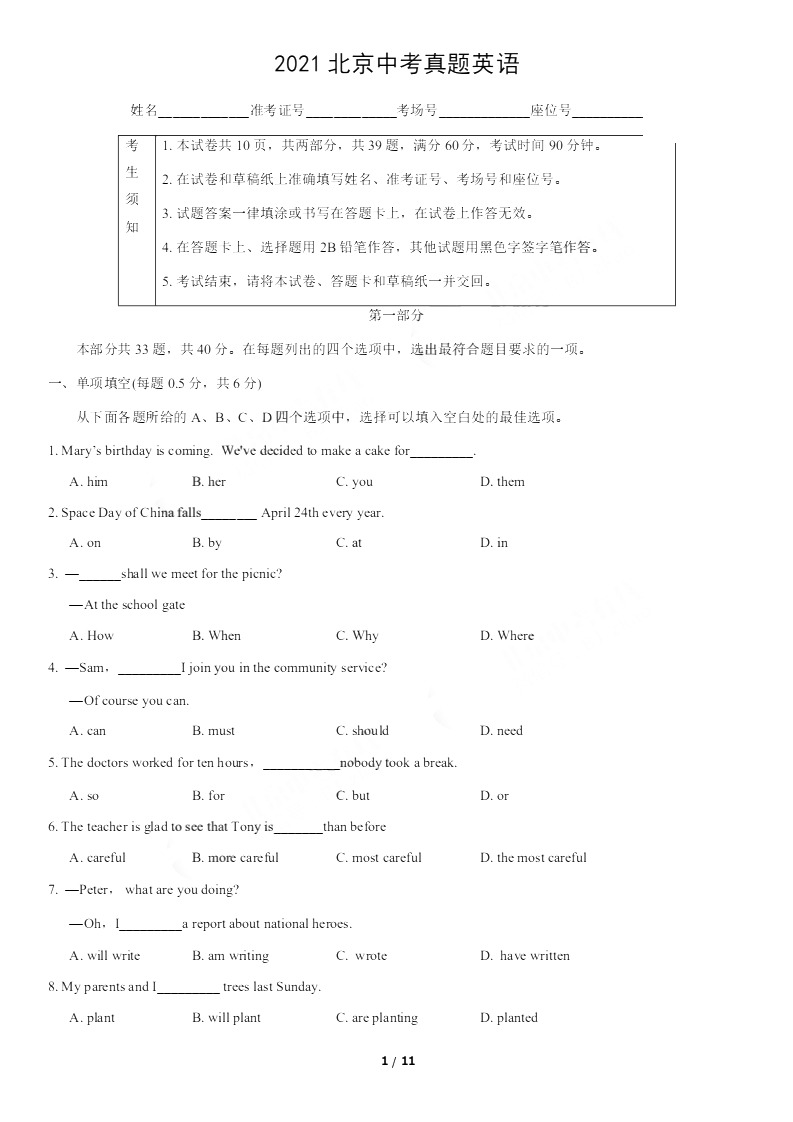 2021年北京市中考英语试题真题已陆续公布,自主选拔在线团队为广大考生收集整理模拟试题及答案,供大家下载。