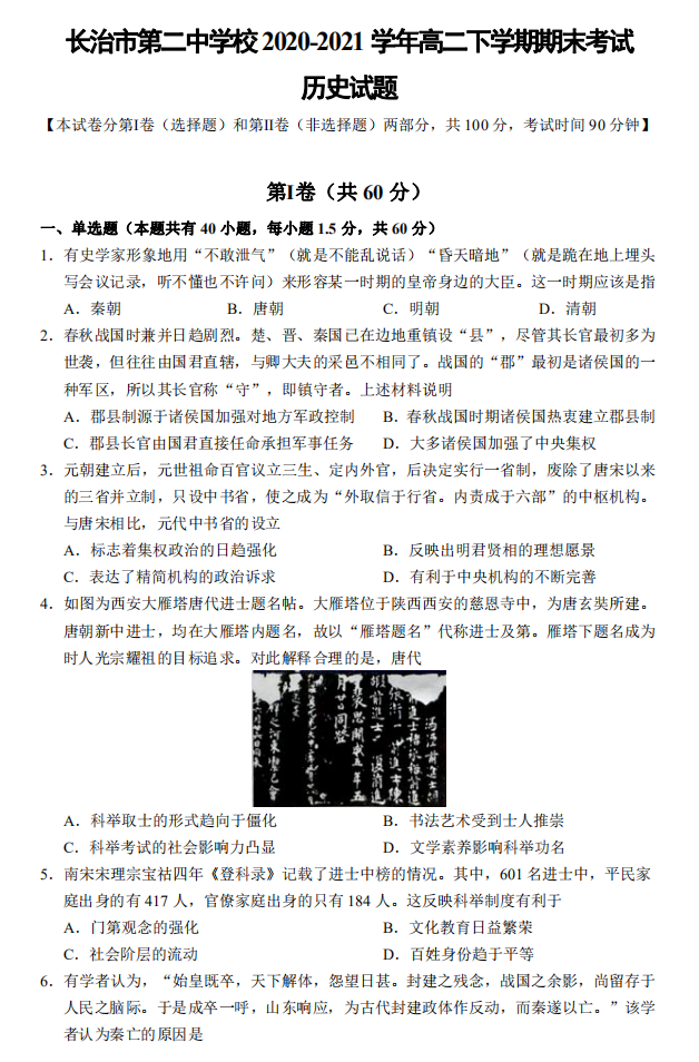 山西省长治市第二中学2020-2021学年高二下学期期末考试已经结束,自主选拔在线团队为广大考生收集整理山西省长治二中2020-2021学年高二下期末考试历史试题,供大家下载。