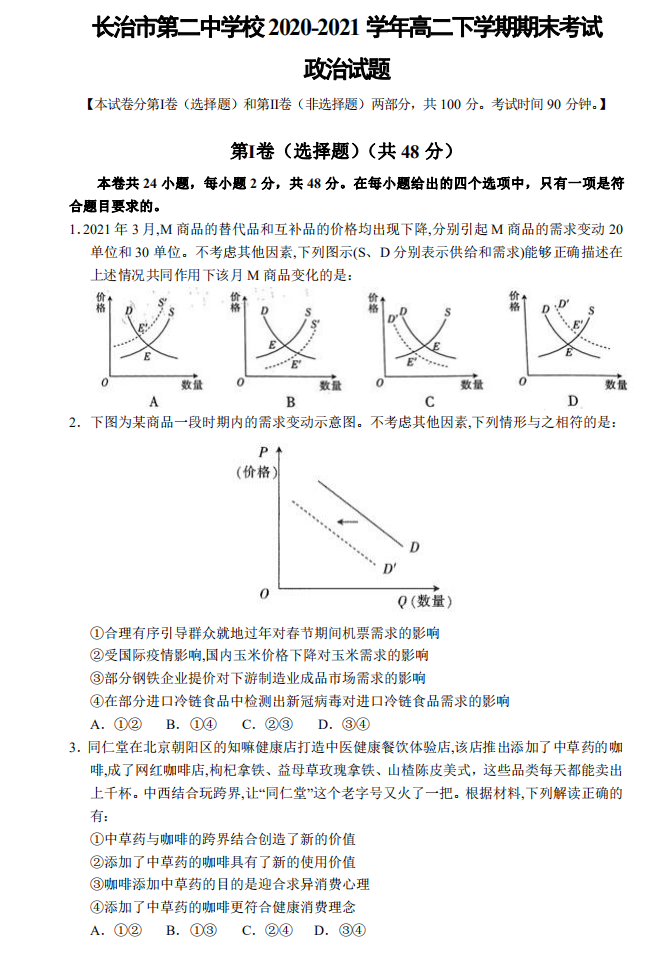 山西省长治市第二中学2020-2021学年高二下学期期末考试已经结束,自主选拔在线团队为广大考生收集整理山西省长治二中2020-2021学年高二下期末考试政治试题,供大家下载。