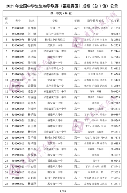 福建省2021年全国中学生生物学联赛省一获奖名单及成绩已经出炉,一等奖共计59人,本文自主选拔在线团队同步更新福建省2021年全国中学生生物学联赛省一获奖名单及成绩,供大家查询。