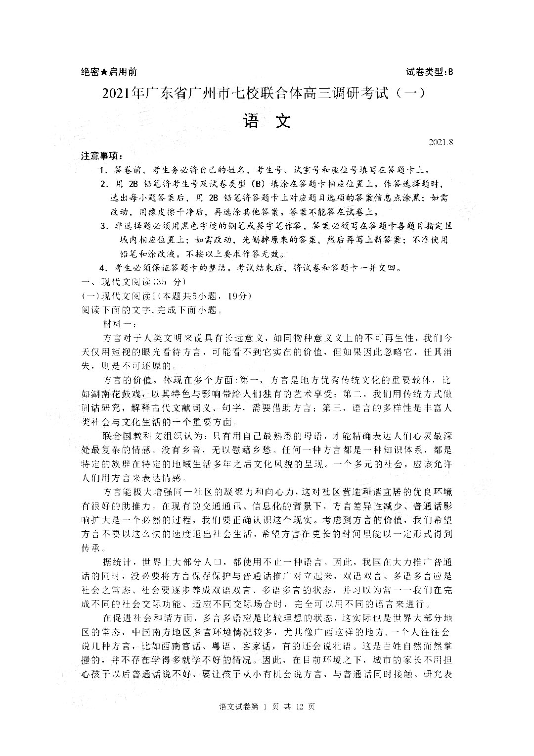 2022届广州七校联合体高三8月联考语文试题已陆续公布,自主选拔在线团队为广大考生收集整理模拟试题及答案,供大家下载。