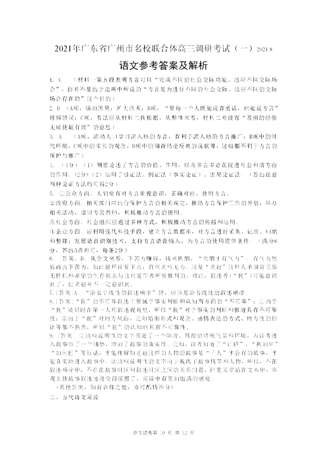 广东省广州市2022届七校联合体高三8月联考语文试题答案