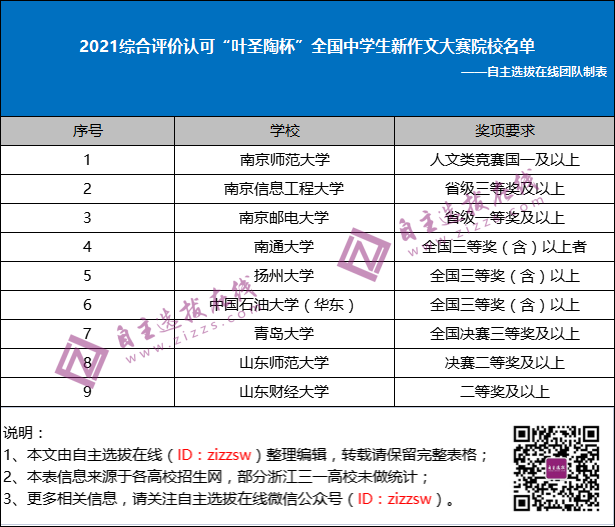 为方便2022届考生、家长了解综合评价招生政策,自主选拔在线团队收集整理2021各个综合评价院校对叶圣陶杯全国中学生新作文大赛的获奖要求,仅供参考。