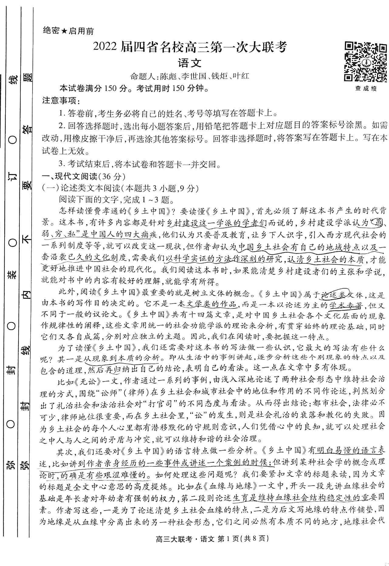 2022四省名校高三第一次大联考于9月22日开考,四省联考试题具有很大参考价值,自主选拔在线团队收集了2022年四省名校高三第一次大联考语文试题,供大家下载查看!