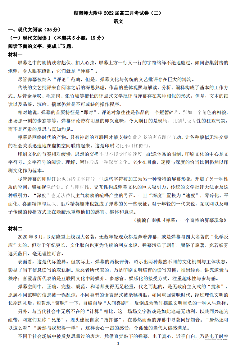 湖南师大附中2022届高三月考试卷二语文试题