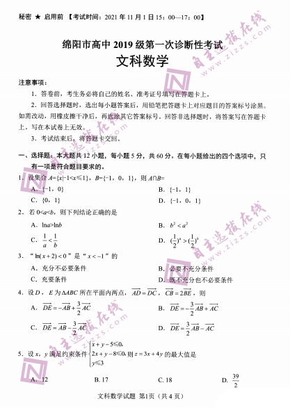 自主选拔在线团队收集整理了四川绵阳市2022届第一次诊断性考试文科数学试题,供大家参考。