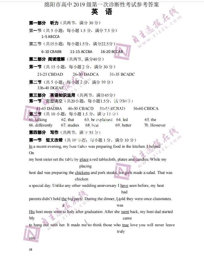 自主选拔在线团队收集整理了四川绵阳市2022届第一次诊断性考试英语试题和答案,供大家参考。