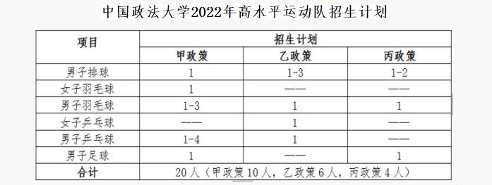根据《教育部办公厅关于做好2022年普通高等学校部分特殊类型招生工作的通知》规定和中国政法大学高水平运动队发展规划,我校2022年继续开展高水平运动队招生工作。现将具体方案公布如下。