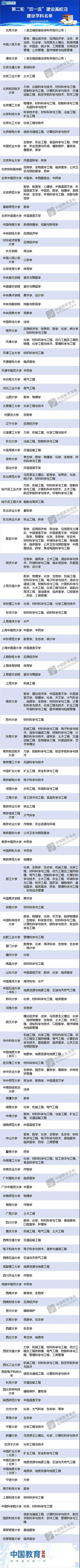 根据国务院《统筹推进世界一流大学和一流学科建设总体方案》,以及教育部、财政部、国家发展改革委《关于深入推进世界一流大学和一流学科建设的若干意见》和《统筹推进世界一流大学和一流学科建设实施办法(暂行)》,经专家委员会认定,教育部等三部委研究并报国务院批准,现公布第二轮“双一流”建设高校及建设学科名单(见附件1)和给予公开警示(含撤销)的首轮建设学科名单(见附件2)。