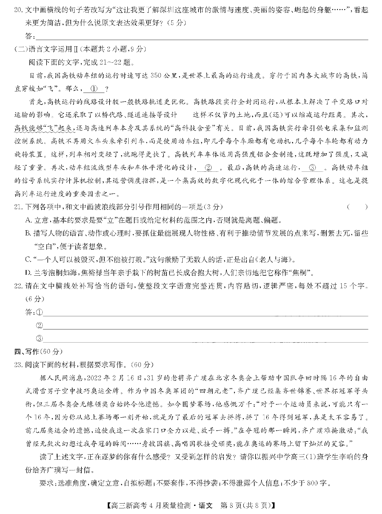 九师联盟2022年高三4月联考语文试题及答案(新高考卷)