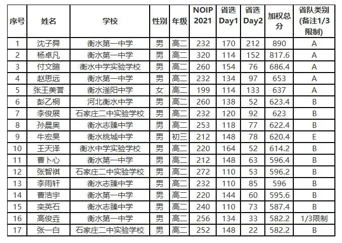 现对NOI2022河北省队入选名单进行公示如下: