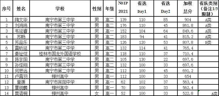 现对NOI2022广西省队入选名单进行公示如下: