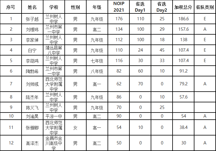 现对NOI2022甘肃省队入选名单进行公示如下: