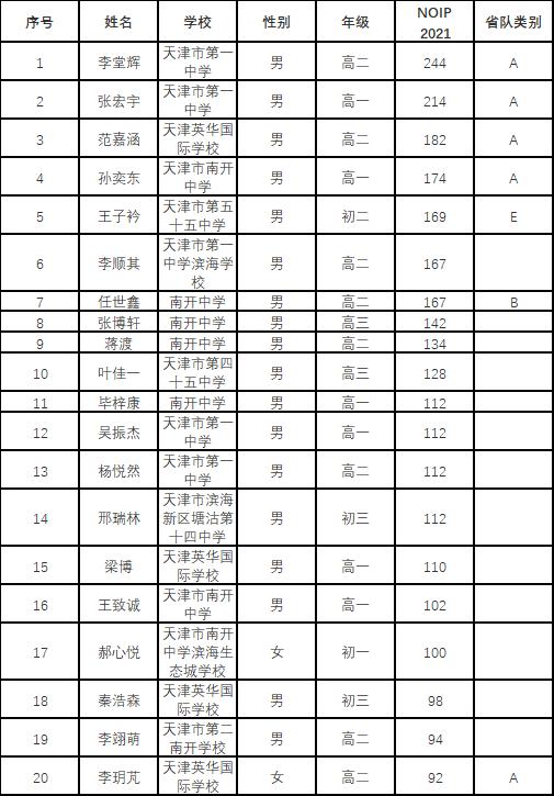 根据《CCF关于NOI2022省内选拔的若干规定》、《CCF NOI2022天津省队选拔通知》,NOI2022省队选拔最终成绩由NOIP2021成绩产生,NOIP2021于2021年11月20日在各省举行,成绩已公布。根据《CCF NOI2022名额分配方案》,天津省队A、B类名额共6人(A队由4名男生和1名女生组成)。其中有1名初中生不占名额,另有2名考生成绩相同的取2021年CSP第二轮认证考试成绩排序。