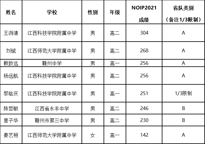 现对NOI2022江西省省队入选名单进行公示如下: